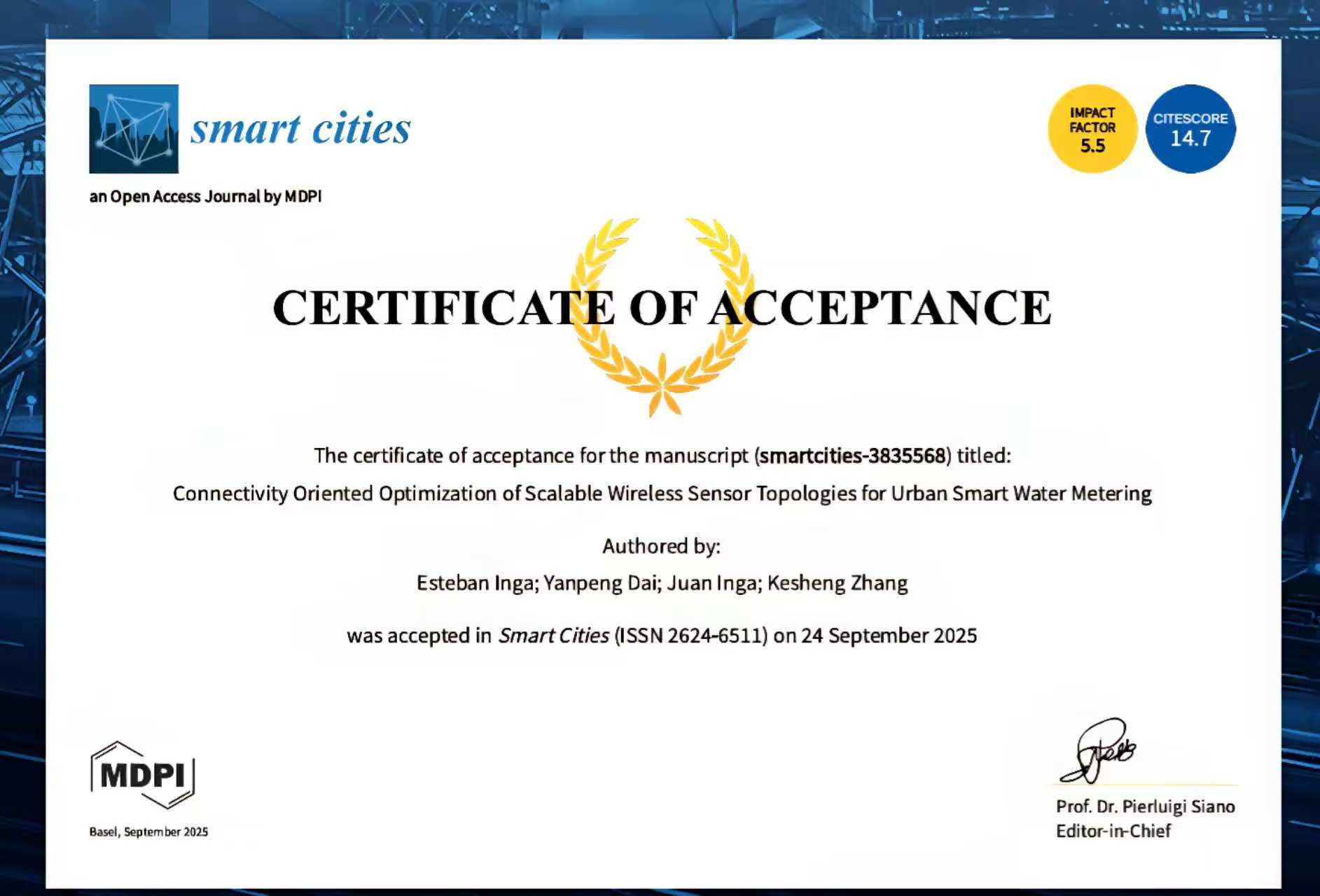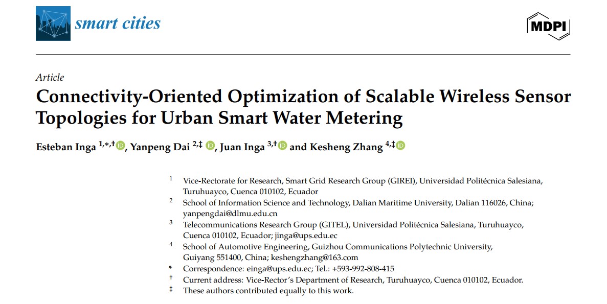 近日,贵州交通职业大学与厄瓜多尔萨莱理工大学的国际合作取得新进展。我校汽车工程学院教师张克声博士与萨莱理工大学研究副校长Esteban Inga博士等学者,在国际期刊《Smart Cities》联合发表题为《Connectivity-Oriented Optimization of Scalable Wireless Sensor Topologies for Urban Smart Water Metering》的学术论文。这标志着两校科研合作迈入实质产出与深度融合的新阶段。