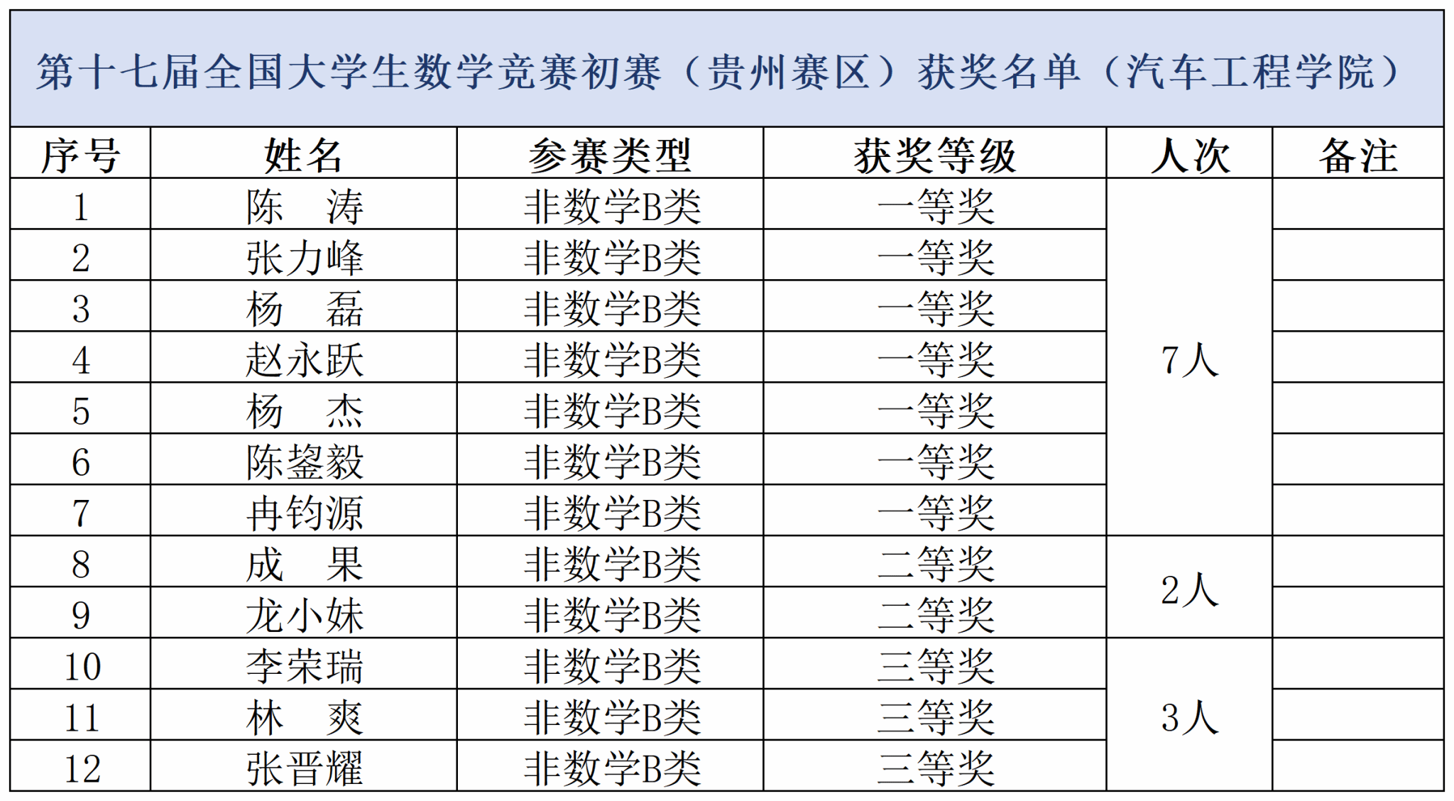 近日,由中国数学会主办、四川大学承办、成都理工大学协办的第十七届全国大学生数学竞赛初赛(贵州赛区)获奖名单正式揭晓。我院学子在此次竞赛非数学B类赛道中表现亮眼,凭借扎实的数学功底与出色的思维能力斩获多项荣誉,为学院与学校赢得了良好声誉。获奖共计12人次,其中陈涛等7名同学获一等奖,成果等2名同学获二等奖,李荣瑞等3名同学获三等奖。