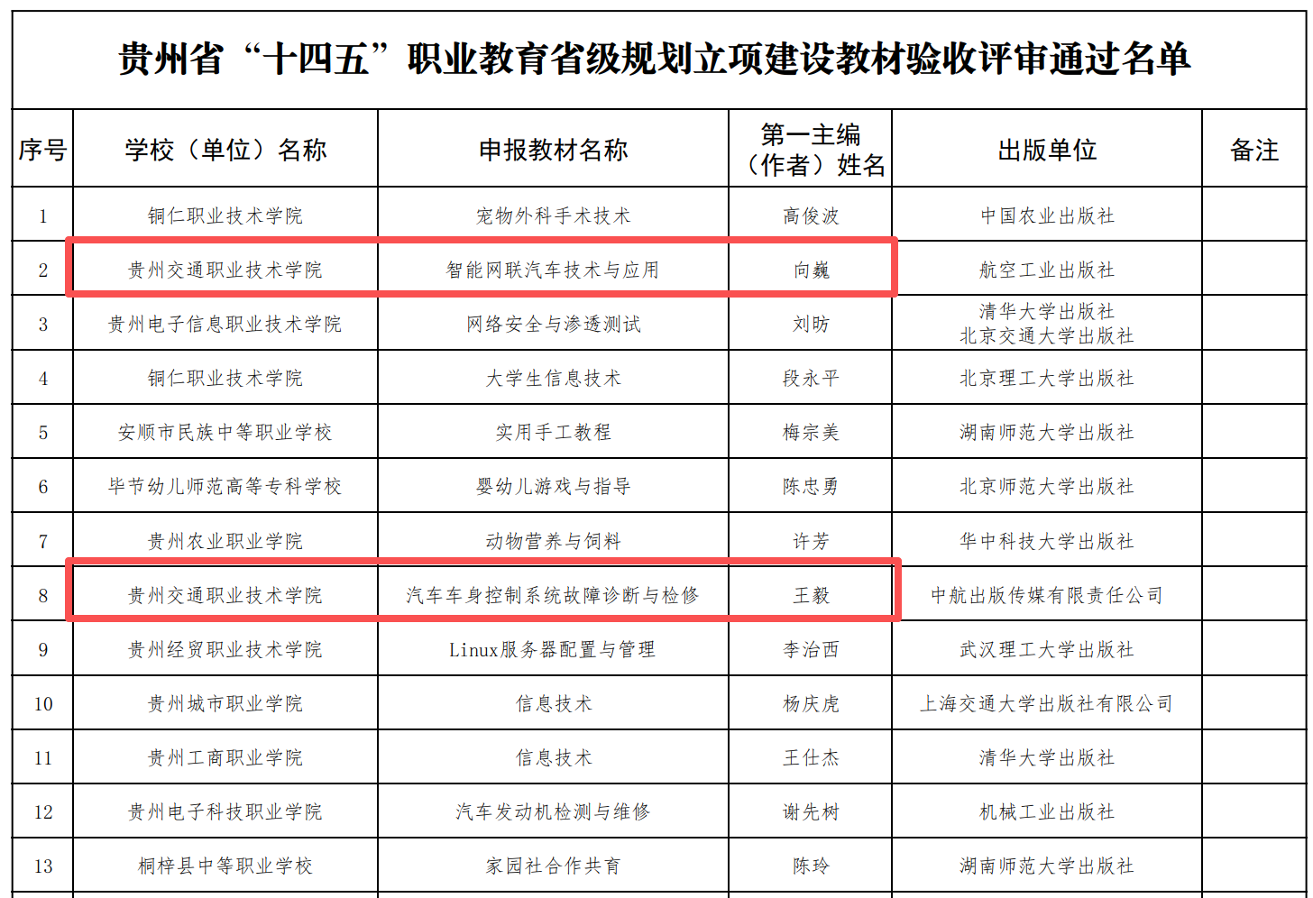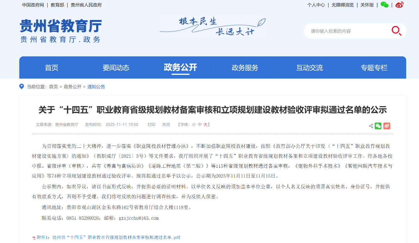近日,教育部与贵州省教育厅先后公示“十四五”职业教育规划教材名单,汽车工程学院成果丰硕:《汽车维护技术》数字教材成功入选第二批“十四五”职业教育国家规划教材,《汽车车身控制系统故障诊断与检修》《智能网联汽车技术与应用》教材顺利通过贵州省“十四五”职业教育规划教材验收评审。三本核心课程配套教材的权威认定,不仅标志着汽车专业群课程建设质量达到新高度,更彰显了汽车工程学院在“岗课赛证”融合、产教协同育人领域的深厚积累。