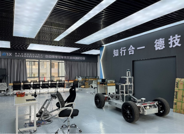 我校与贵州智能网联汽车龙头企业——贵州翰凯斯智能技术有限公司联合建设自动驾驶汽车技术协同创新中心,中心涵盖智能网联汽车实训基地、智能网联汽车创新实验室、实车测试基地、远程驾驶和监控中心四个部分。拥有自动驾驶开发教学套件、无人驾驶安防巡检车、无人驾驶物流配送车、远程驾驶及监控座舱控制台、无人巴士等实训教学设备。占地面积60平方米,设备价值160万元(含企业捐赠105万)